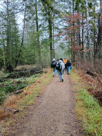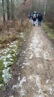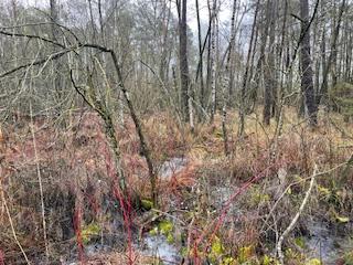 C'est avec un guide que nous avons parcouru cette lande marécageuse entre cornouillers aux ramures rouges et bouleaux aux troncs blancs, en longeant une rivière aux eaux noires où barbotent canards colverts et ... quelques pieds d'élèves.