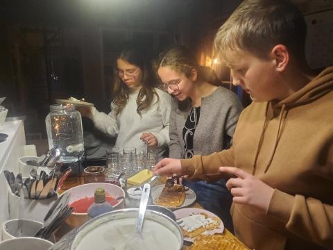 Certains d'entre nous se sont retrouvés en soirée pour célébrer la journée de la gaufre et nous nous sommes régalés de confiture de framboise, de coulis de fraise ou de rhubarbe.